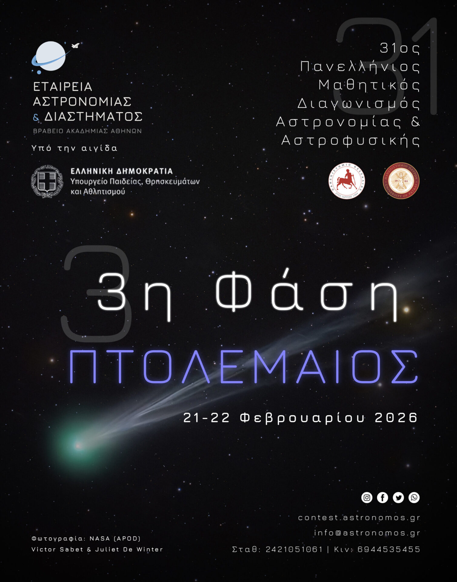 Τα θέματα του διαγωνισμού θα αναρτηθούν στις 8:55 π.μ. της Κυριακής, 21/12/25 στην ηλεκτρονική ιστοσελίδα του Διαγωνισμού Αστρονομίας: contest.astronomos.gr